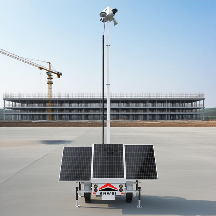 Der mobile Solarüberwachungsanhänger besteht aus monokristallinen Silizium-Solarpanelen, Gelbatterien, kaltverzinktem Stahl, einem 7 Meter langen elektrischen Mast, hochauflösenden Überwachungskameras, 4 manuellen Stützbeinen, 2 verschleißfesten Reifen und 1 Anhängerkupplung. Er zeichnet sich durch ausgezeichnete Stabilität, Haltbarkeit und Anwendbarkeit aus.